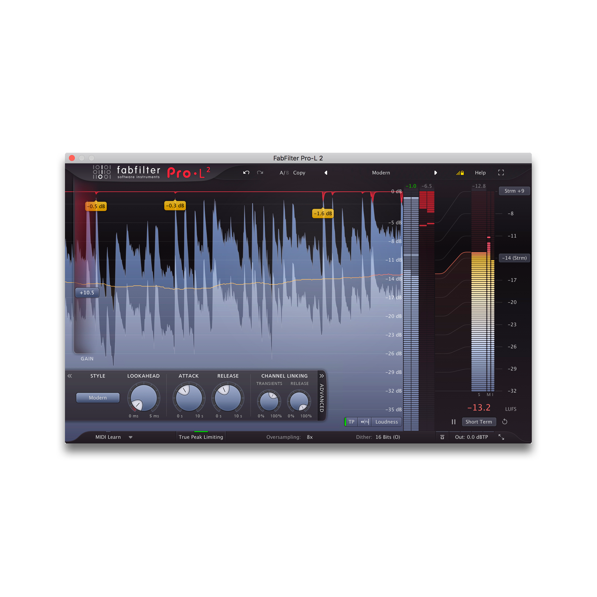Thanks to the support for Dolby Atmos 7.0.2 and 7.1.2 formats with flexible surround channel linking, FabFilter Pro-L 2 is ideal for multichannel scenarios. Useful features like a DC offset filter, external sidechain triggering for stem mastering, and a Unity Gain option for listening to the limiting effect at unity gain level make Pro-L 2 a must-have in any mastering environment. Beyond that, 32x linear-phase oversampling ensures top-shelf sound quality